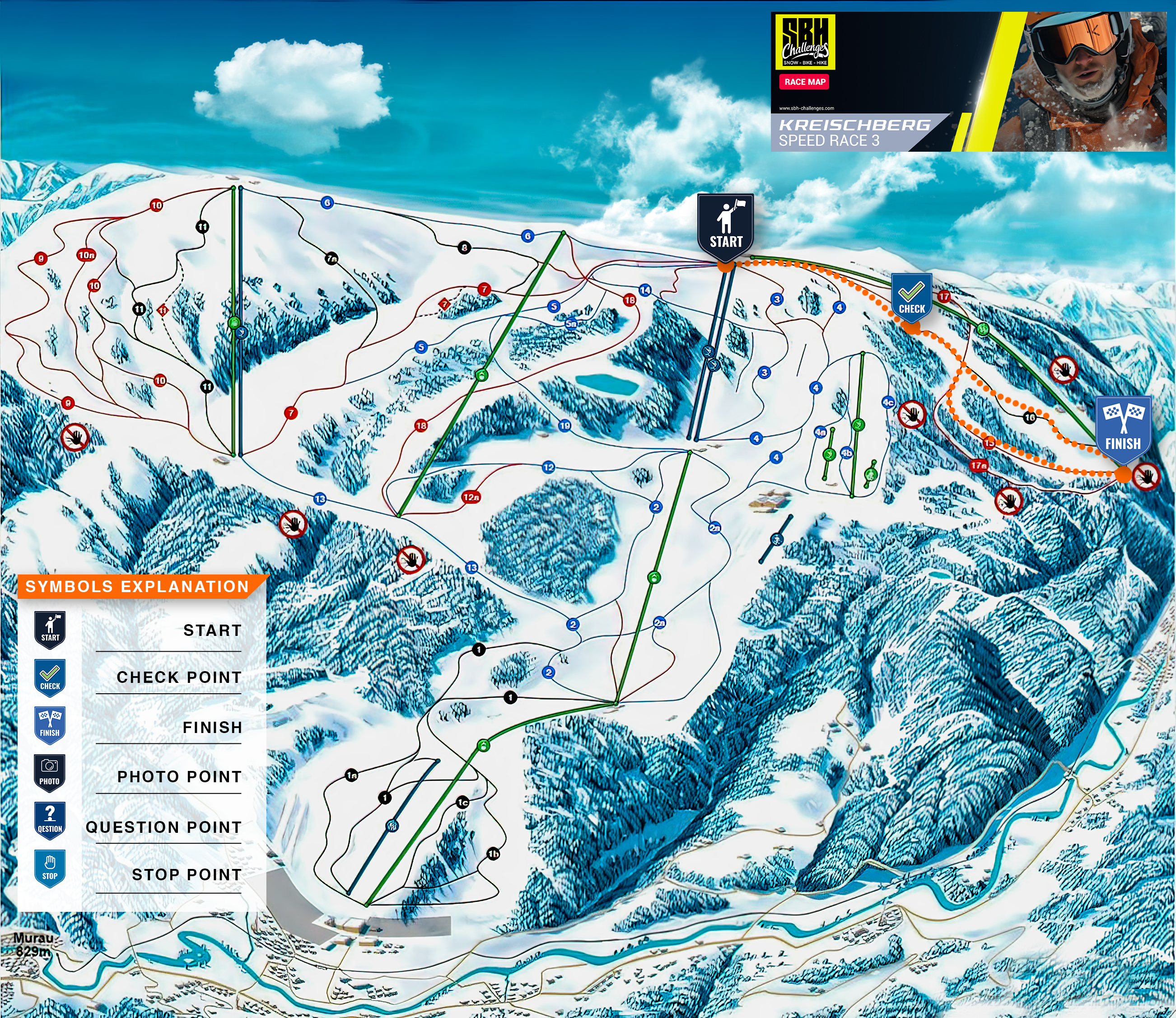 Az 1 830 méteres muraui pálya lendületes szakaszokkal és néhány technikás kanyarral várja a síelőket. A három kijelölt check pointon összesen 300 pont szerezhető, így a kihívás egyszerre szól a tempóról és a pontos kivitelezésről.
